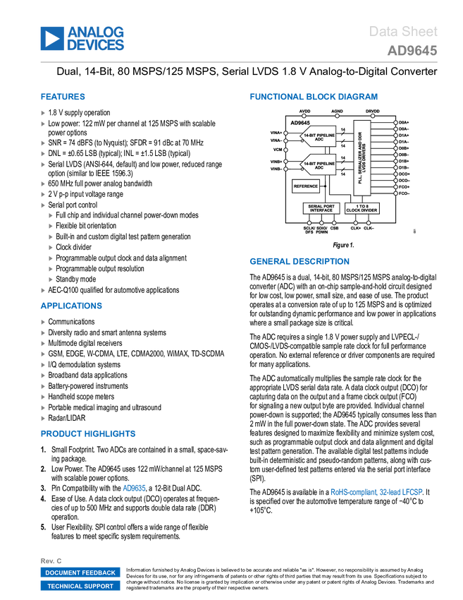 AD9645 Dual, 14-Bit, 80 MSPS/125 MSPS Serial LVDS 1.8 V Analog-to-Digital Converte...