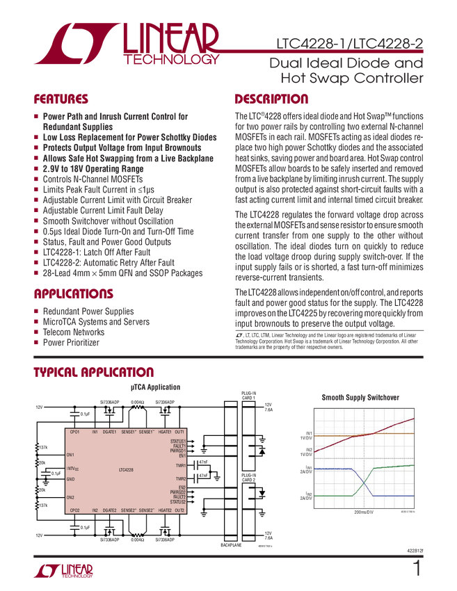 LTC4228-1 LTC4228-2 Dual Ideal Diode and Hot Swap Controller