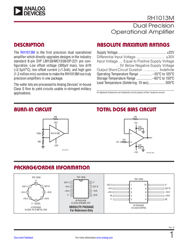 RH1013M Dual Precision Operational Amplifier