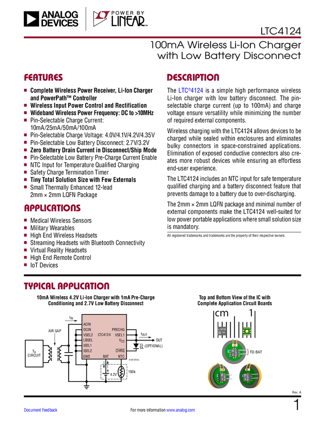 LTC4124 100mA Wireless Li-Ion Charger with Low Battery Disconnect