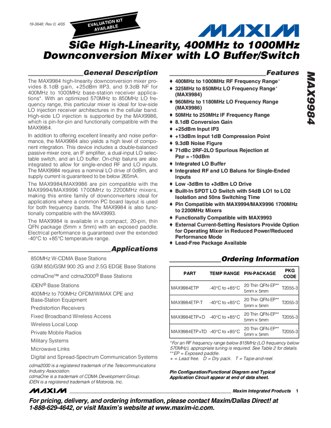 MAX9984 SiGe High-Linearity, 400MHz to 1000MHz Downconversion Mixer with LO Buffer/...