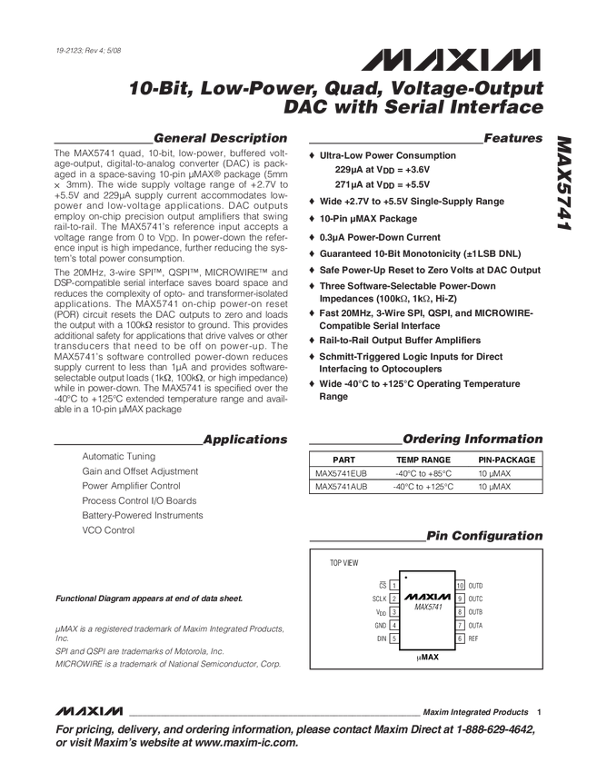 MAX5741 10-Bit, Low-Power, Quad, Voltage-Output DAC with Serial Interface
