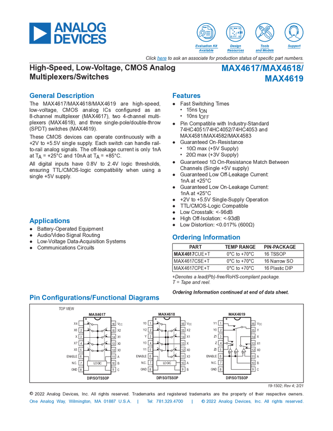 MAX4617 High-Speed, Low-Voltage, CMOS Analog Multiplexers/Switches