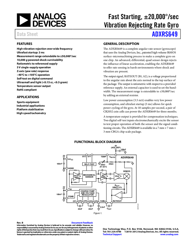 ADXRS649 Fast Starting, ±20,000°/sec Vibration Rejecting Rate Gyro