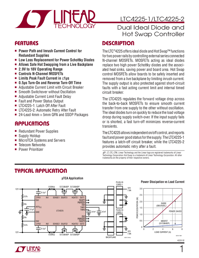 LTC4225-1 LTC4225-2 Dual Ideal Diode and Hot Swap Controller