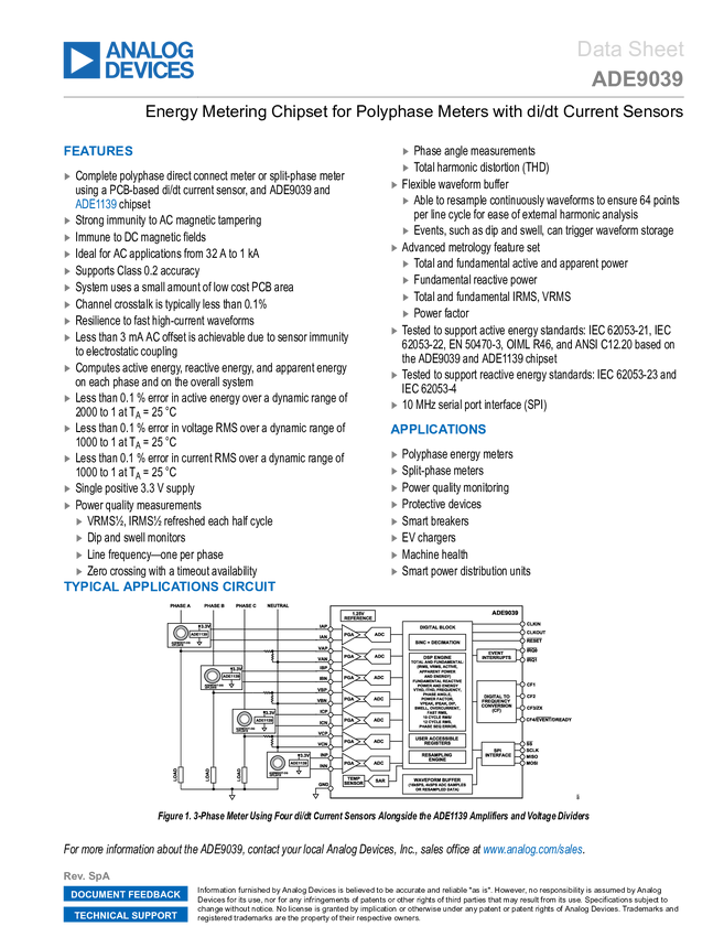 ADE9039 Energy Metering Chipset for Polyphase Meters with di/dt Current Sensors