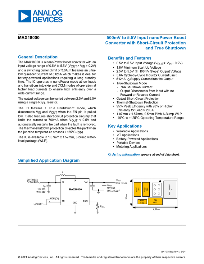 MAX18000 500mV to 5.5V Input nanoPower Boost Converter with Short-Circuit Protection