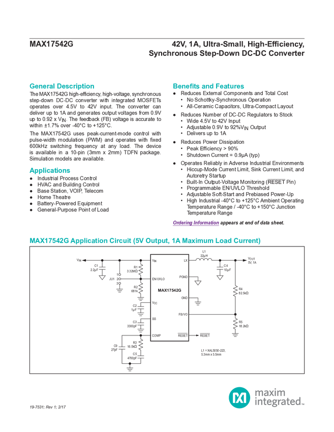MAX17542G 42V, 1A, Ultra-Small, High-Efficiency, Synchronous Step-Down DC-DC Converte...