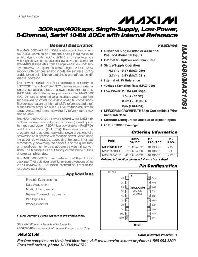 MAX1080 300ksps/400ksps, Single-Supply, Low-Power, 8-Channel, Serial 10-Bit ADCs wi...