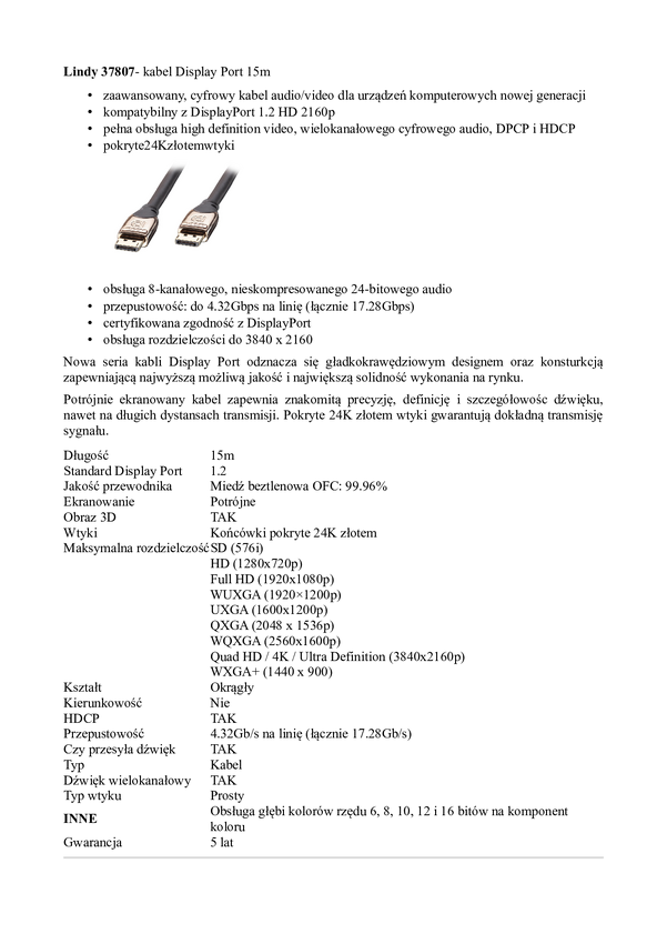 - Kabel Displayport wtyk/wtyk 4K wysoka jakość długość 5m, Kabel Displayport wtyk/wtyk 4K wysoka jakość długość 7,5m, Kabel Displayport wtyk/wtyk 4K wysoka jakość długość 15m, Lindy 36298 kabel Displayport 1.2 wtyk/wtyk 4K wysoka jakość długość 20m