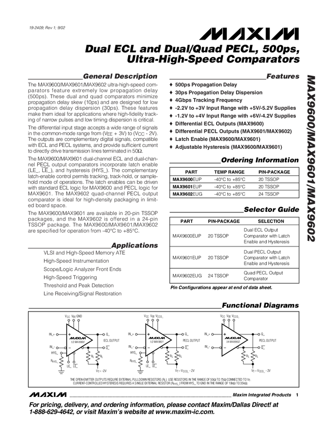 MAX9600 Dual ECL and Dual/Quad PECL, 500ps, Ultra-High-Speed Comparators
