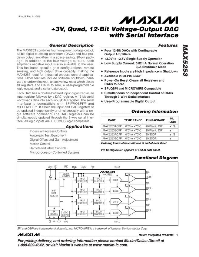 MAX5253 +3V, Quad, 12-Bit Voltage-Output DAC with Serial Interface