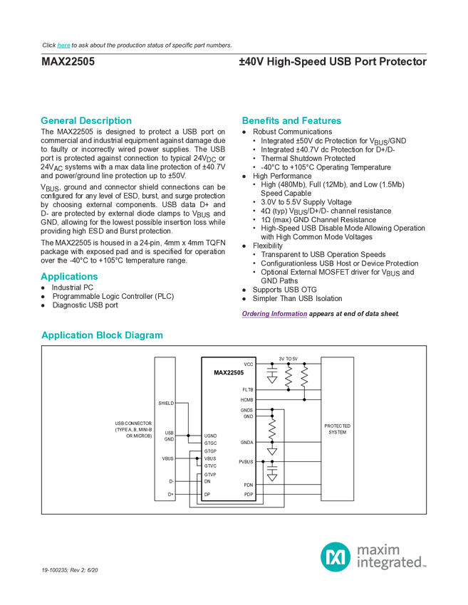 MAX22505 ±40V High-Speed USB Port Protector