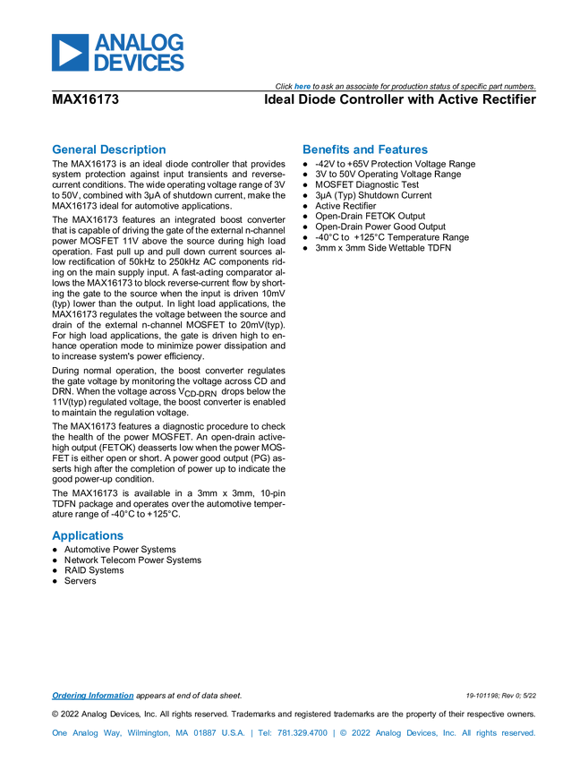 MAX16173 Ideal Diode Controller with Active Rectifier