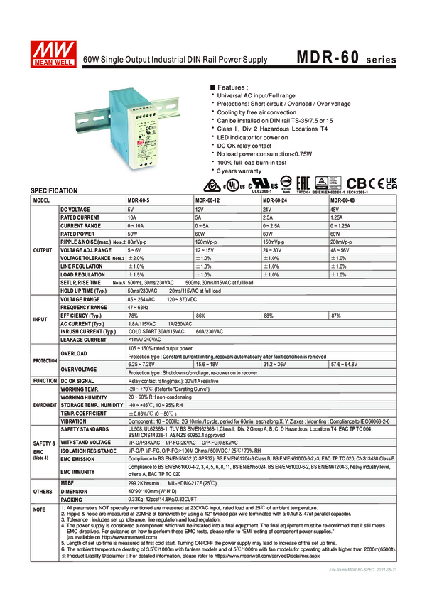 MDR-60-5 Zasilacz na szynę DIN 5V 10A 50W MEAN WELL | MDR-60-5