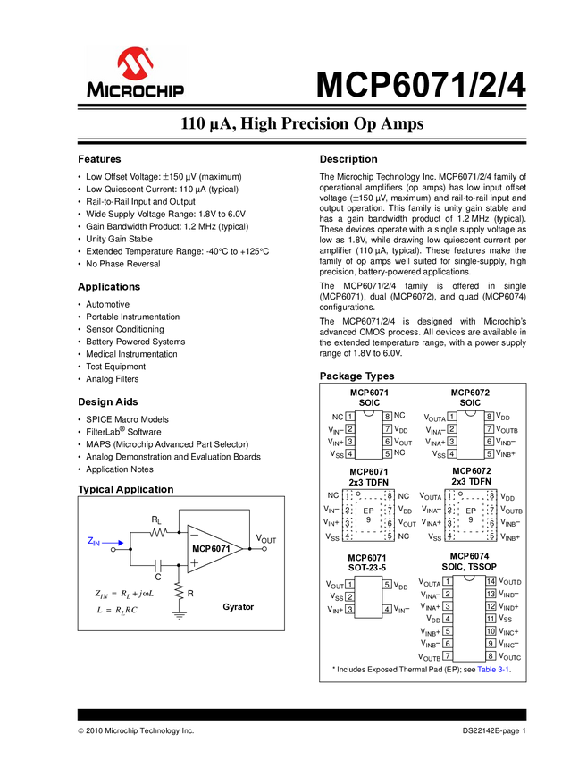 MCP6071/2/4, 110 µA, High Precision Op Amps