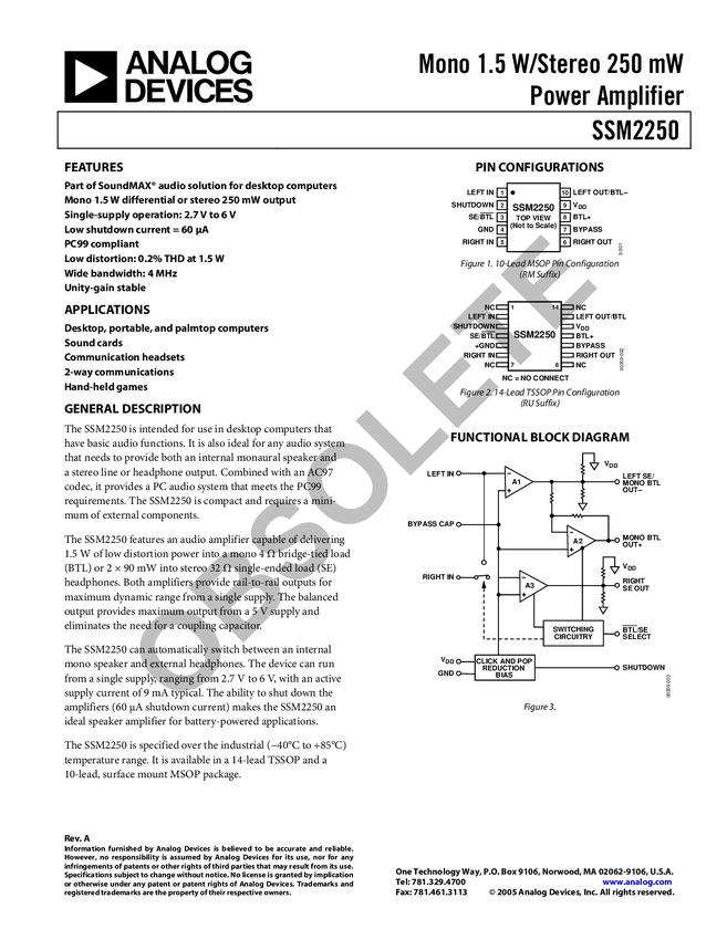 SSM2250 Mono 1.5 W/Stereo 250 mW Power Amplifier