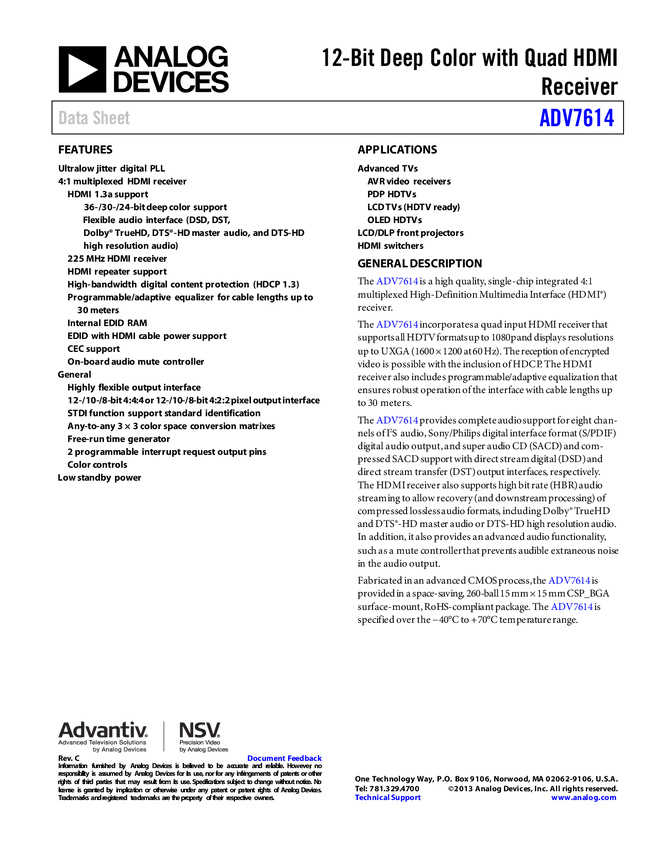 ADV7614 12-bit Deep Color Quad HDMI Receiver
