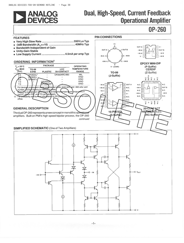 OP260 Dual, High-Speed, Current Feedback Operational Amplifier
