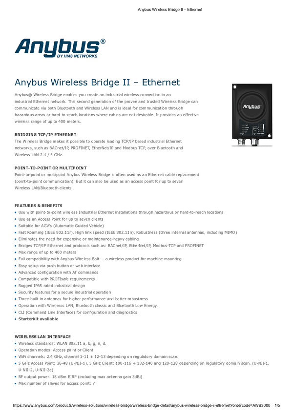 Mostek bezprzewodowy Anybus AWB3300 Bluetooth, Ethernet, WLAN
