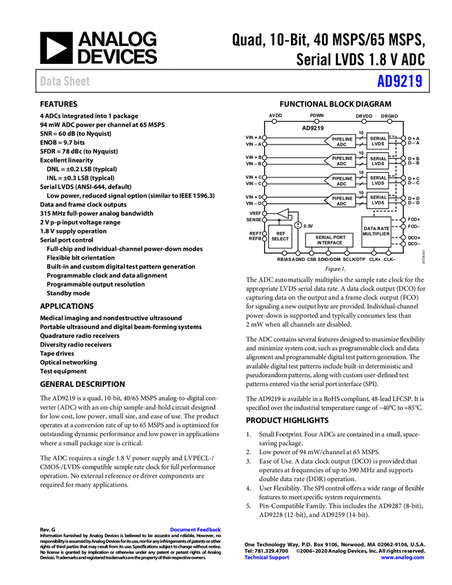 AD9219 Quad, 10-Bit, 40/65 MSPS Serial LVDS 1.8 V A/D Converter