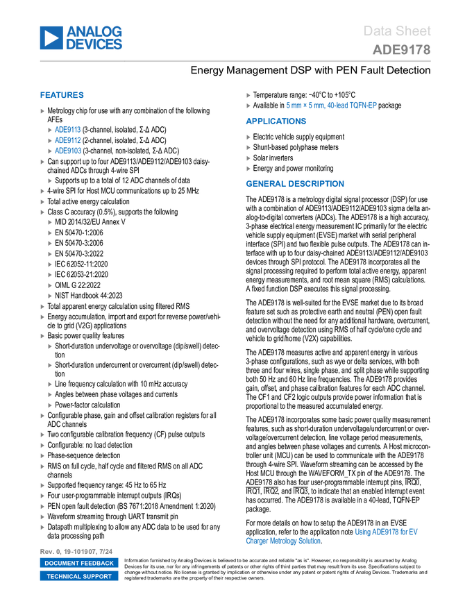 ADE9178 Energy Management DSP with PEN Fault Detection