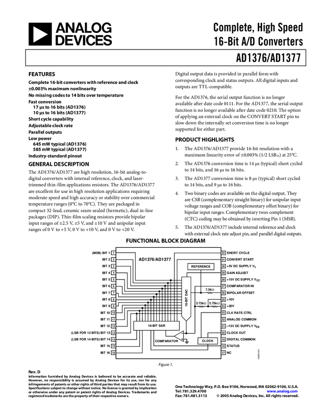 AD1376 Complete, High Speed 10 µs to 16-Bit A/D Converter