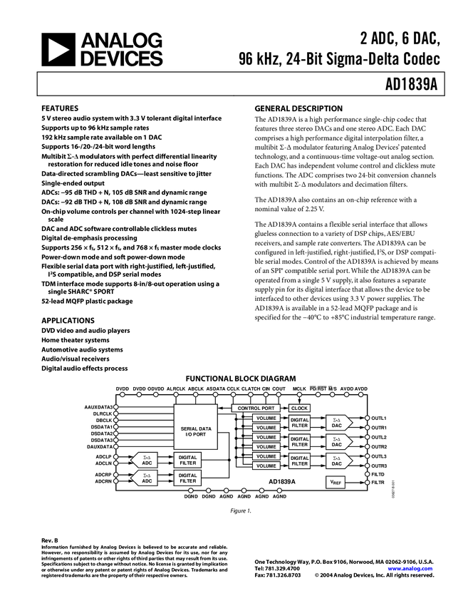 AD1839A 2 ADC, 6 DAC 96 kHz, 24-Bit Sigma Delta Codec