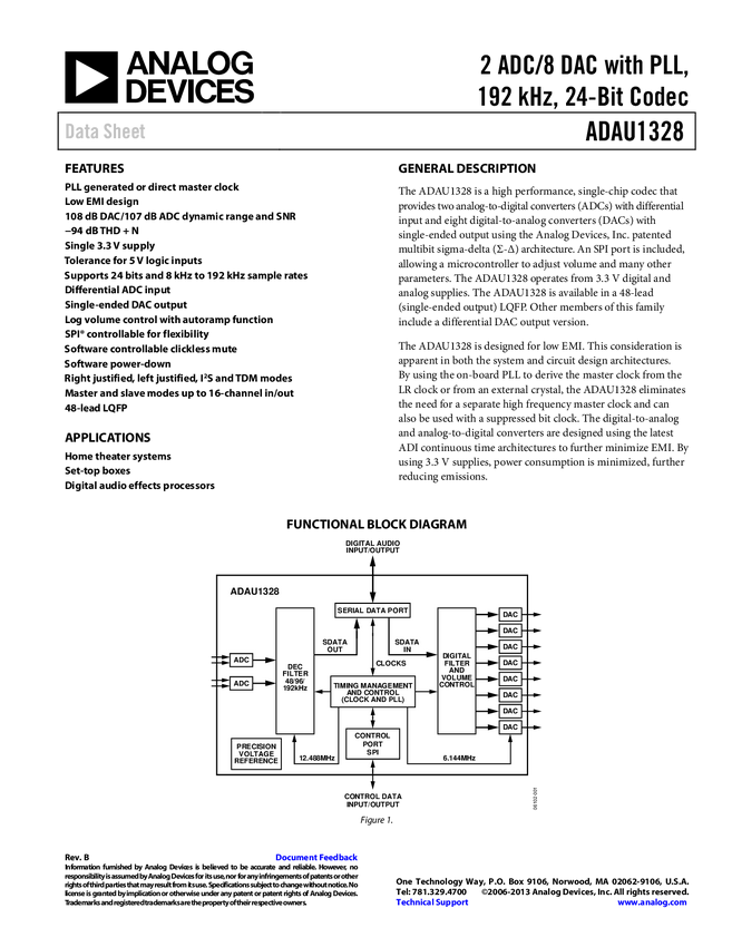 ADAU1328 2 ADC/8 DAC with PLL, 192 kHz, 24-Bit Codec