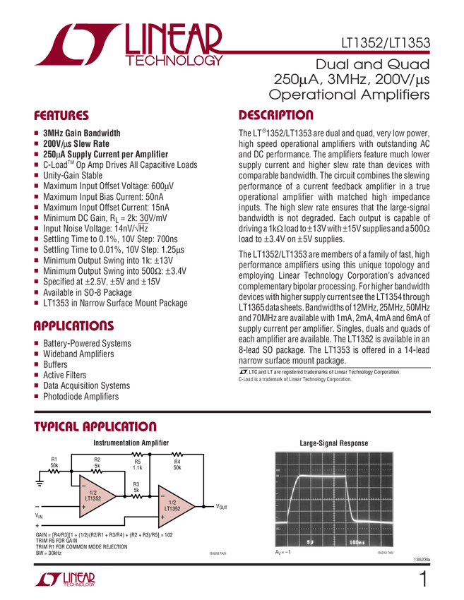 LT1352 Dual and Quad 250µA, 3MHz, 200V/µs Operational Amplifier
