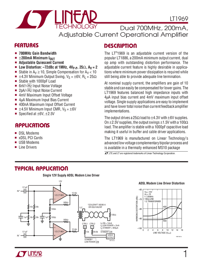 LT1969 Dual 700MHz, 200mA, Adjustable Current Operational Amplifier