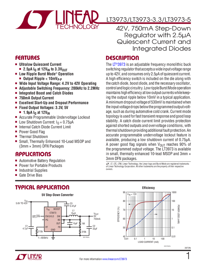 LT3973 42V, 750mA Step-Down Regulator with 2.5μA Quiescent Current and Integrated...