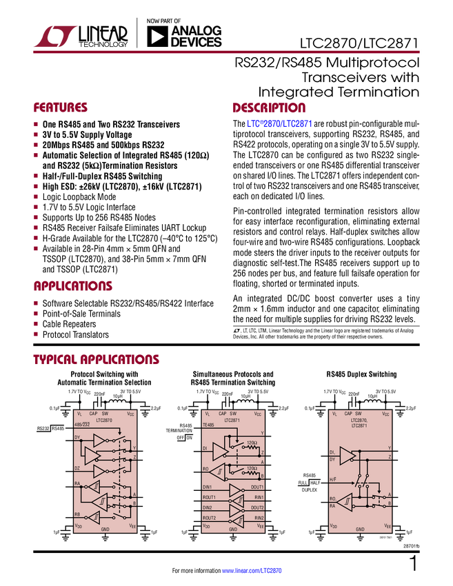 LTC2871 RS232/RS485 Multiprotocol Transceivers with Integrated Termination