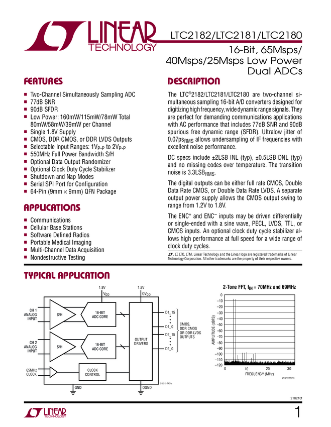 LTC2180 16-Bit, 25Msps Low Power Dual ADCs