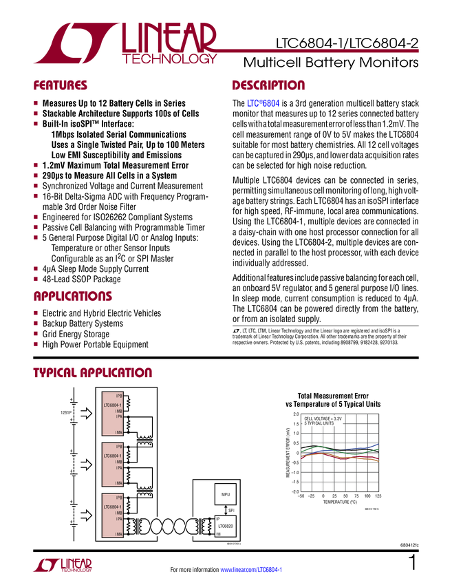 LTC6804-1 12 Channel Multicell Battery Monitor with Daisy Chain Interface, Generation...