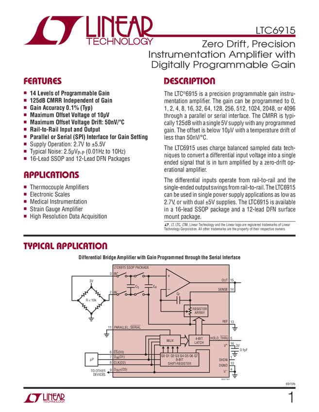 LTC6915 Zero Drift, Precision Instrumentation Amplifier with Digitally Programmable...