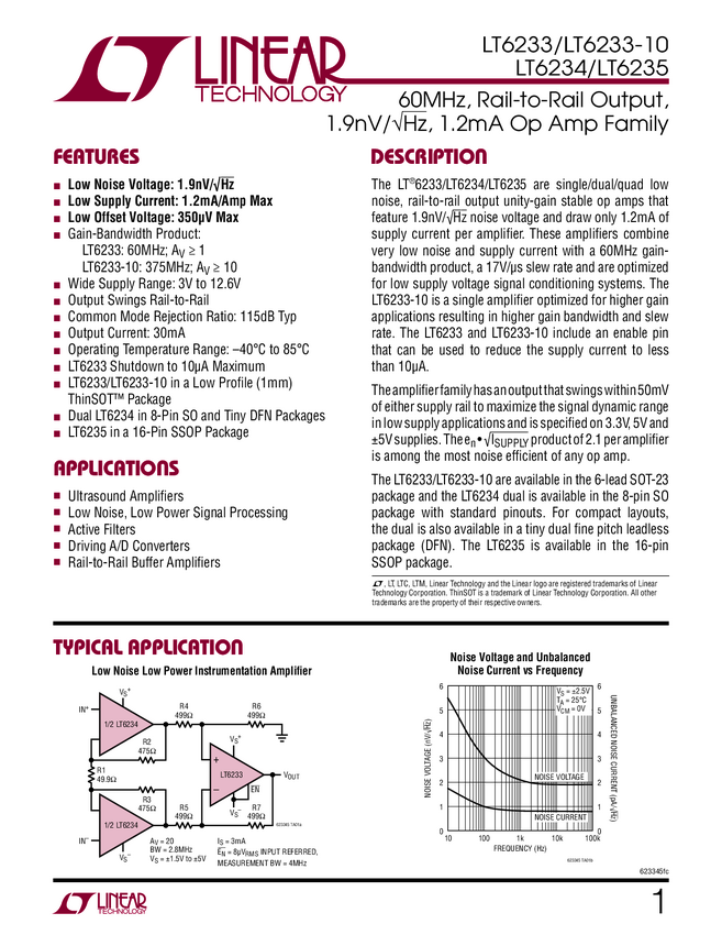 LT6233 60MHz, Rail-to-Rail Output, 1.9nV/√, 1.2mA Op Amp Family