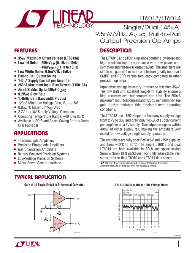 LT6013 Single 145µA, 9.5nV/√, AV ≥ 5, Rail-to-Rail Output Precision Op Amps
