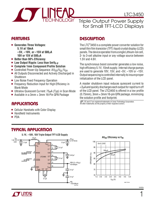 LTC3450 Triple Output Power Supply for Small TFT-LCD Displays