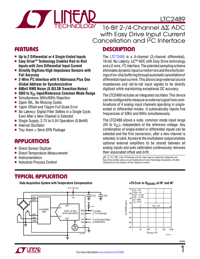 LTC2489 16-Bit 2-/4-Channel ∆Σ ADC with Easy Drive Input Current Cancellation and I...