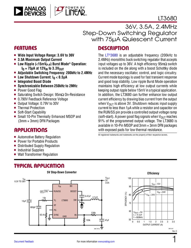 LT3680 36V, 3.5A, 2.4MHz Step-Down Switching Regulator with 75µA Quiescent Current
