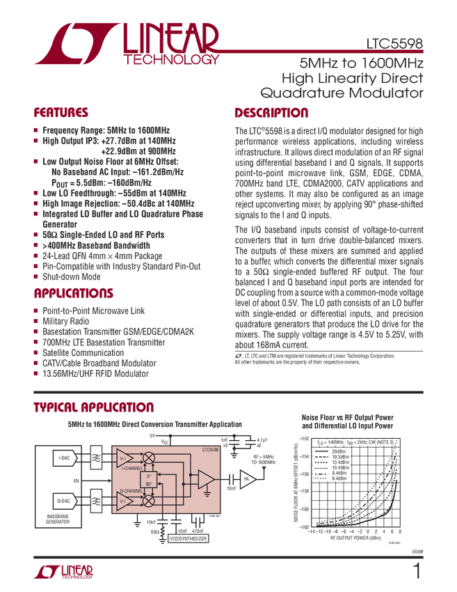 LTC5598 5MHz to 1600MHz High Linearity Direct Quadrature Modulator