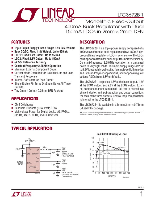 LTC3672B-1 Monolithic Fixed-Output 400mA Buck Regulator with Dual 150mA LDOs in 2mm x...