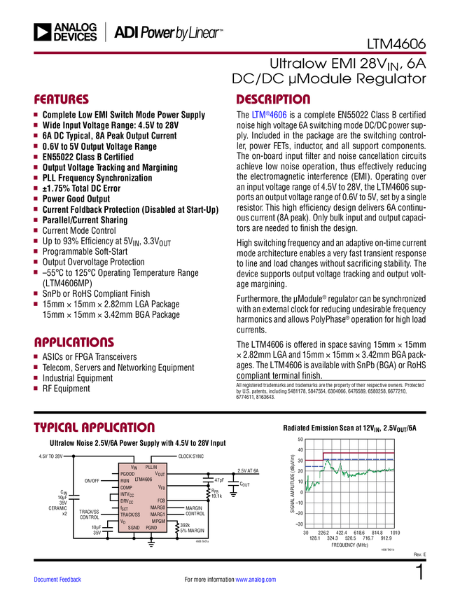 LTM4606 Ultralow EMI 28V, 6A DC/DC μModule Regulator