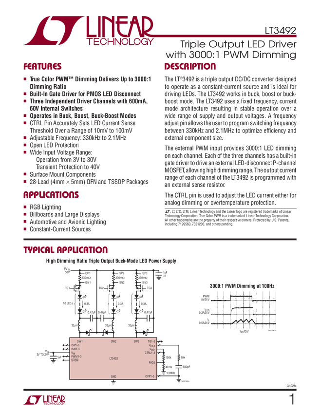 LT3492 Triple Output LED Driver with 3000:1 PWM Dimming