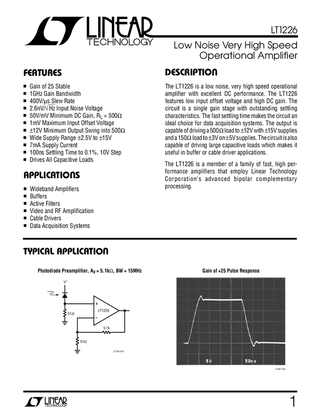 LT1226 Low Noise Very High Speed Operational Amplifier