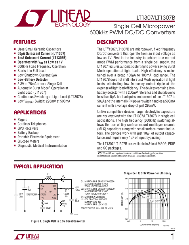 LT1307 Single Cell Micropower 600kHz PWM DC/DC Converters