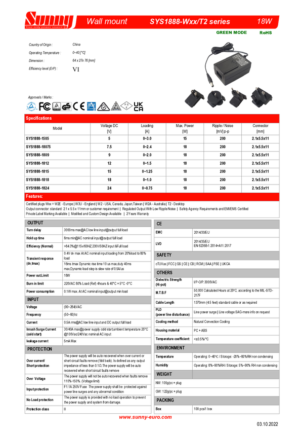 SYS1888-1809-2155 Zasilacz wtyczka/desktop SUNNY 9V 2A 18W | SYS1888-1809