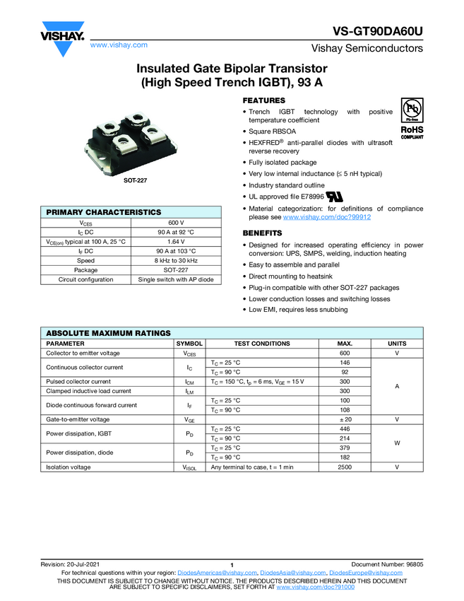 VS-GT90DA60U Insulated Gate Bipolar Transistor (High Speed Trench IGBT), 93 A
