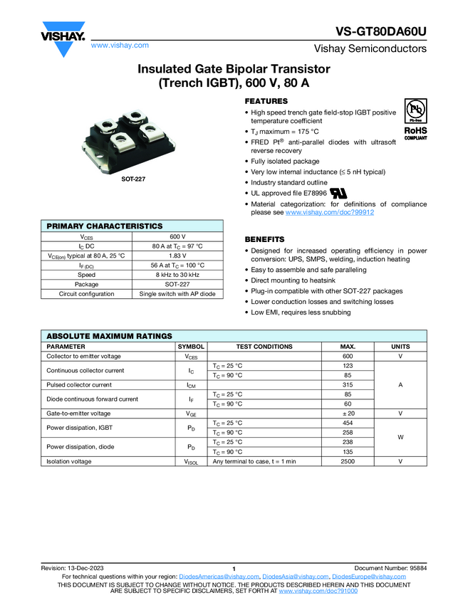 VS-GT80DA60U Insulated Gate Bipolar Transistor (Trench IGBT), 600 V, 600 A